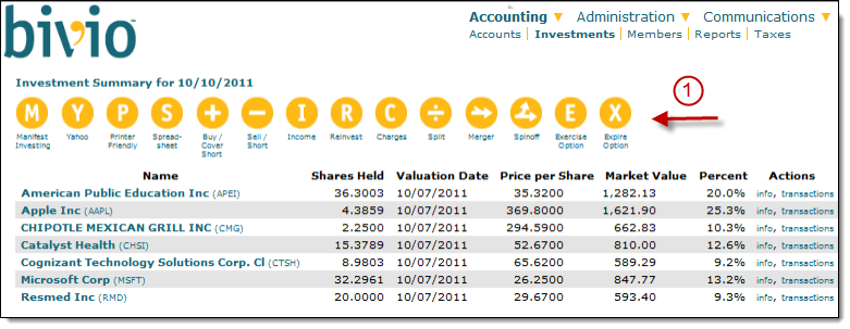 At the top of the list of investments you will see various buttons which will lead you to forms where you can enter transactions related to your investments.